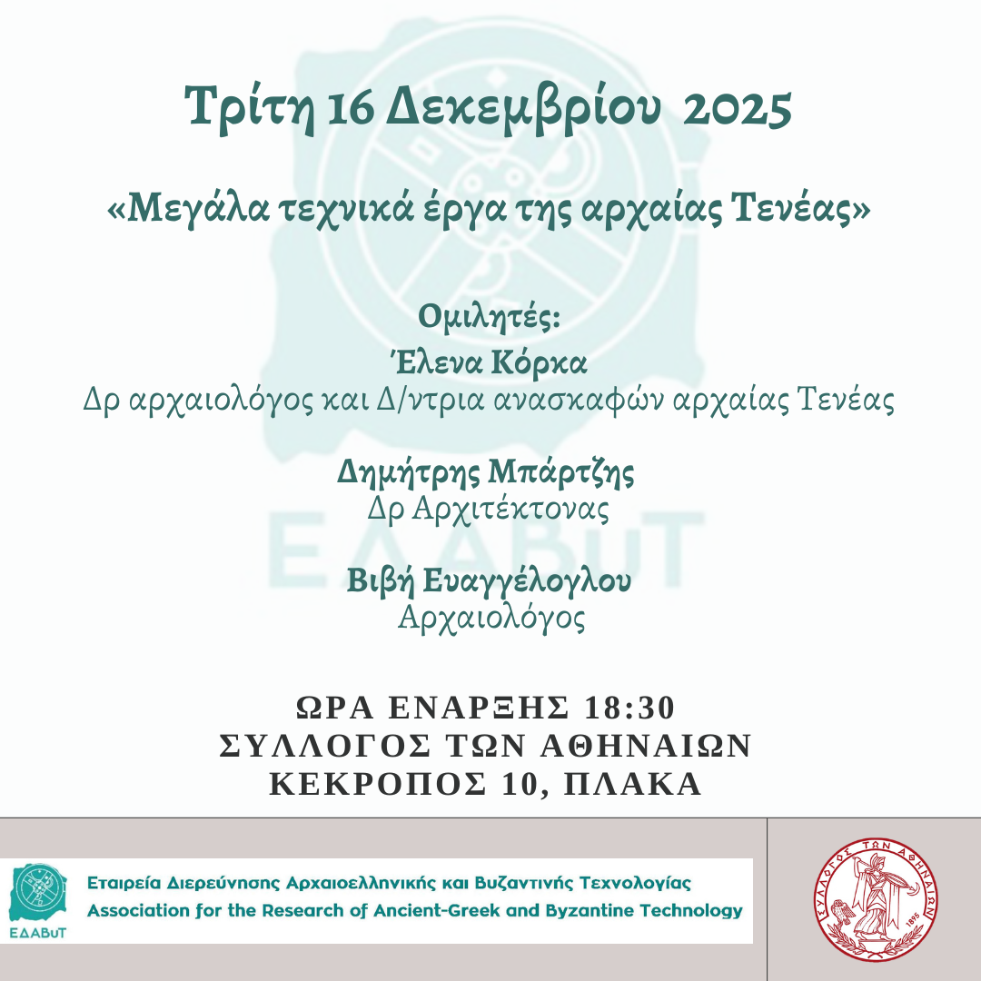 Την Τρίτη 16 Δεκεμβρίου 2025 και ώρα 18:30 θα πραγματοποιηθεί στον «Σύλλογο των Αθηναίων» στο πλαίσιο των εκδηλώσεων της ΕΔΑΒυΤ η ομιλία με θέμα «Μεγάλα τεχνικά έργα της αρχαίας Τενέας».