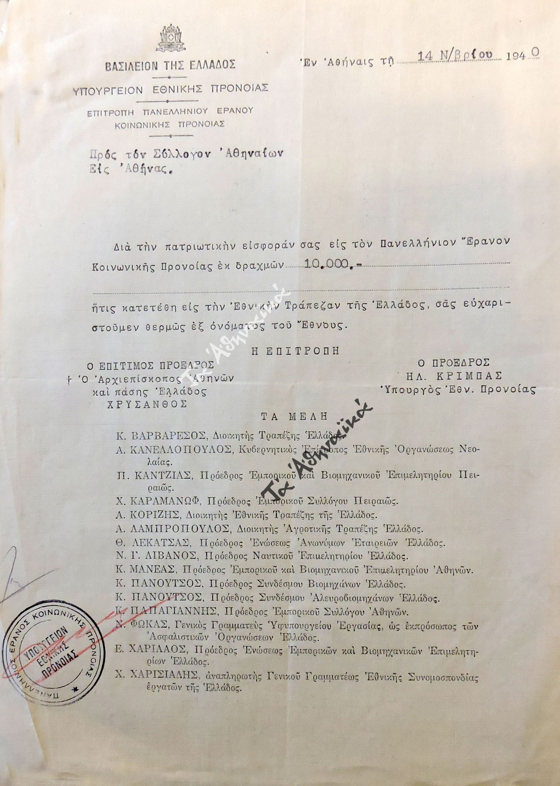 Επιστολή της Επιτροπής Πανελληνίου Εράνου προς τον Σύλλογο των Αθηναίων για τη δωρεά 10.000 δραχμών στον Πανελλήνιο Έρανο. 14/11/1940.
