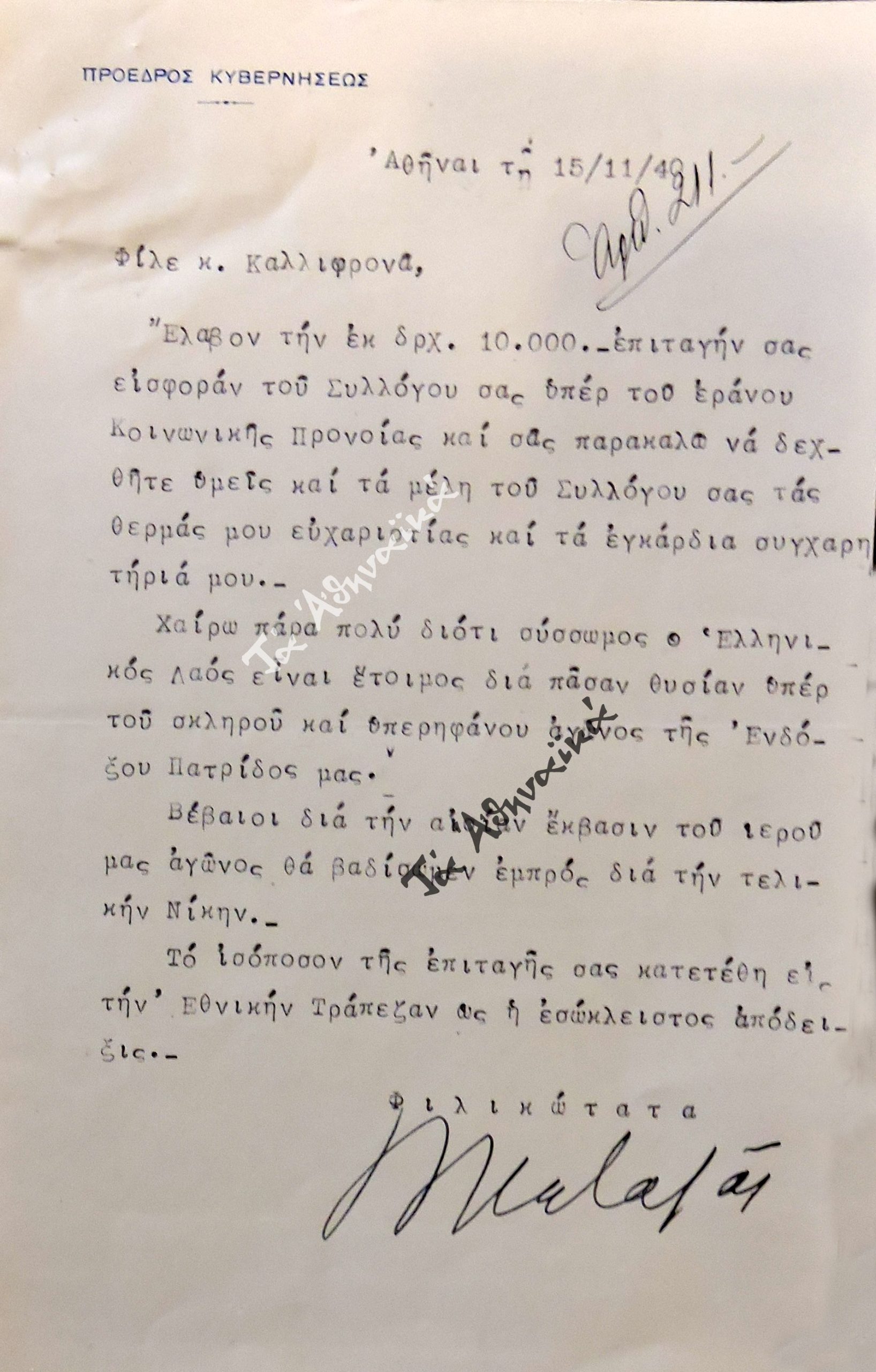 Ευχαριστήρια Επιστολή του Ιωάννη Μεταξά προς τον Λάμπρο Καλλιφρονά για την καταβολή 10.000 δραχμών στον έρανο Κοινωνικής Πρόνοιας από τον «Σύλλογο των Αθηναίων». 15/11/1940.