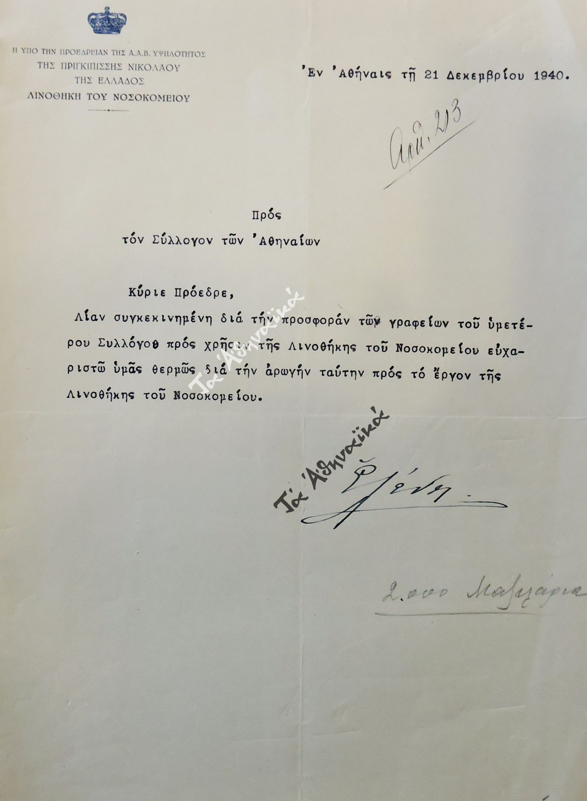 Επιστολή της Πριγκίπισσας Ελένης του Νικολάου της Ελλάδος προς το Σύλλογο των Αθηναίων για τη διάθεση των γραφείων του «Συλλόγου των Αθηναίων» προς χρήση της Λινοθήκης του Νοσοκομείου. 21/12/1940.