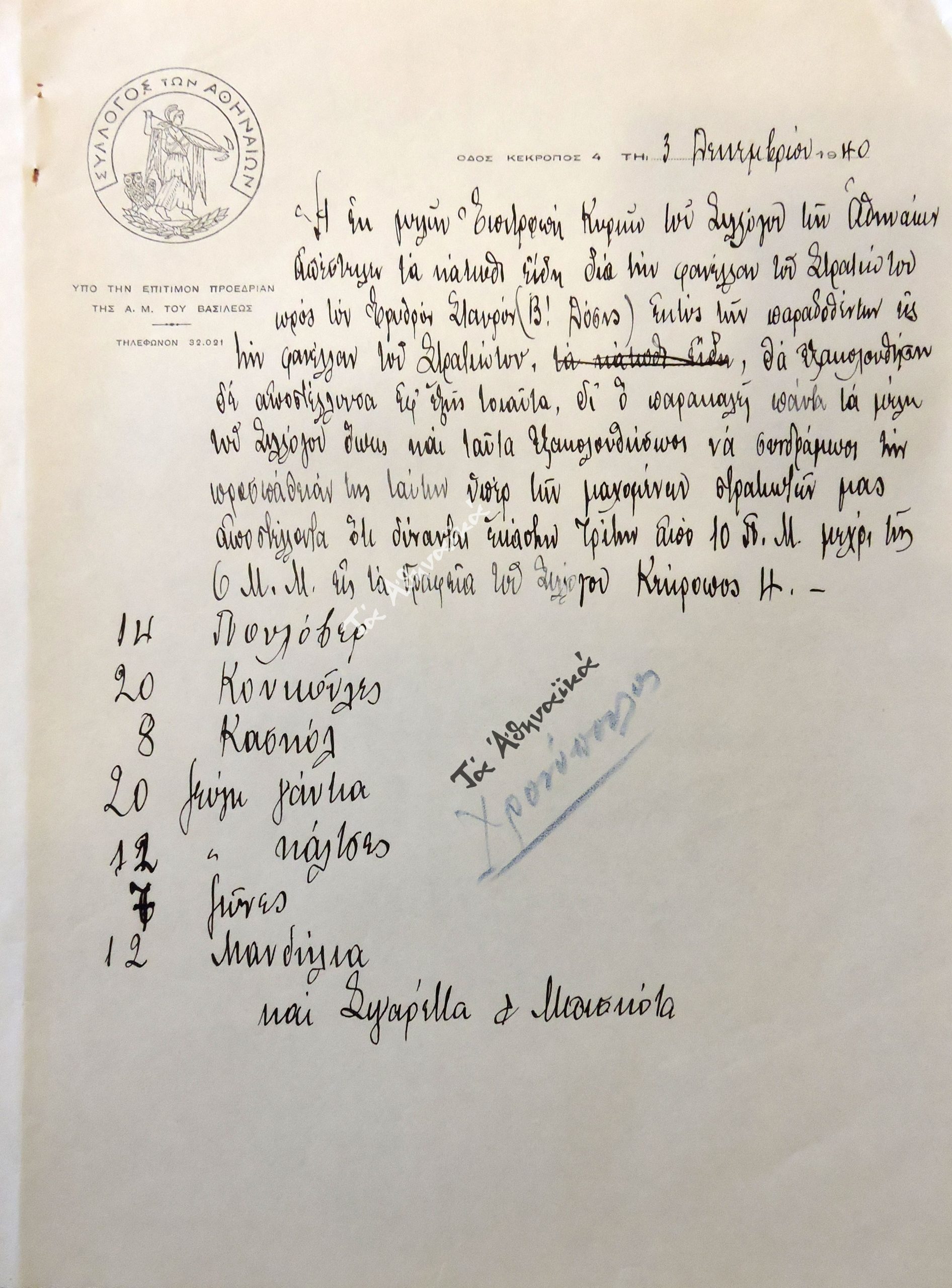 Αναφορά της Επιτροπής Κυριών του «Συλλόγου των Αθηναίων» για τη δωρεά ειδών στη Φανέλλα του Στρατιώτου. 3/12/1940.